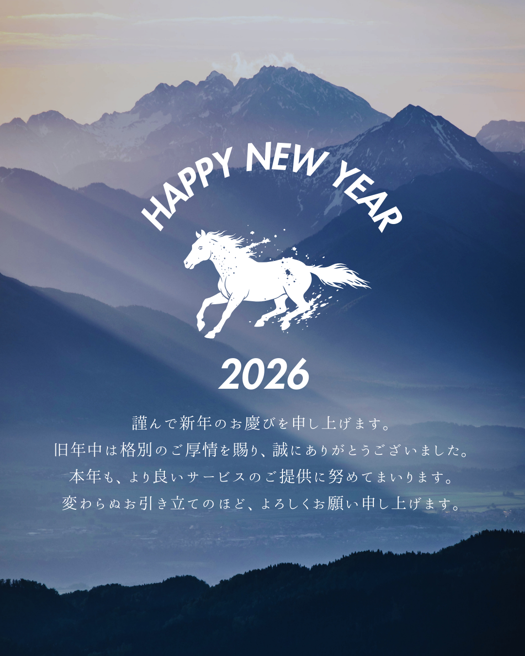 【新年のご挨拶】 2026/01/06 【新年明けましておめでとうございます】 旧年中は、格別のご高配を賜り厚く御礼申し上げます。今年も私たちは、皆様により良いサービスを提供できるよう、誠心誠意努めて参ります。変わらぬご愛顧を賜りますようお願い申し上げます。 新たな年が、皆様にとって健康で幸多き一年となりますよう、心よりお祈り申し上げます。 この一年も、皆様にとって価値ある時間となりますように。 そして、素晴らしい瞬間を多く共有できることを楽しみにしております。本年も宜しくお願い申し上げます。